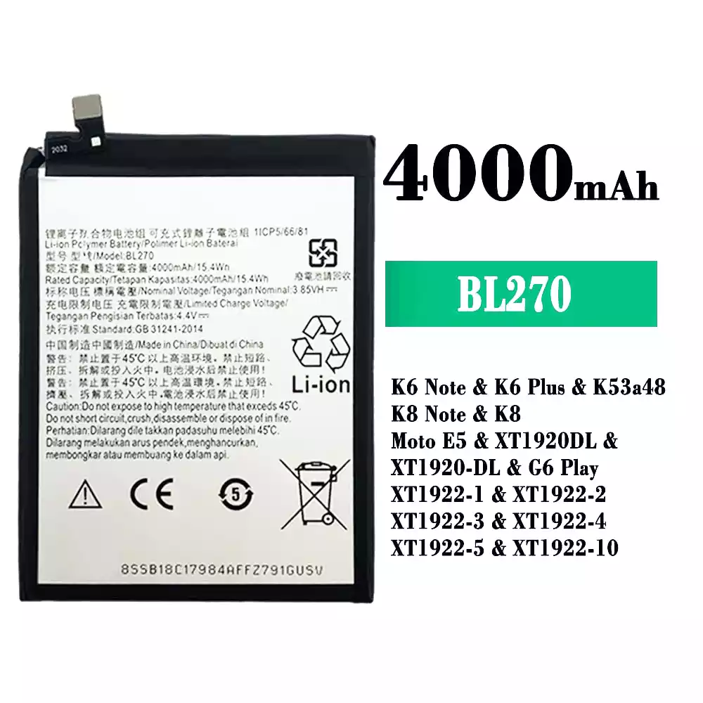 Bateria BL270 para Lenovo K6 Note / K6 Plus / K53a48 / K8 Note / K8 / Moto E5 / XT1920DL / XT1920-DL / G6 Play / XT1922-1 / XT1922-2 / XT1922-3 / XT1922-4 / XT1922-5 / XT1922-10