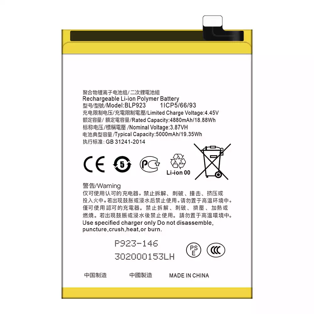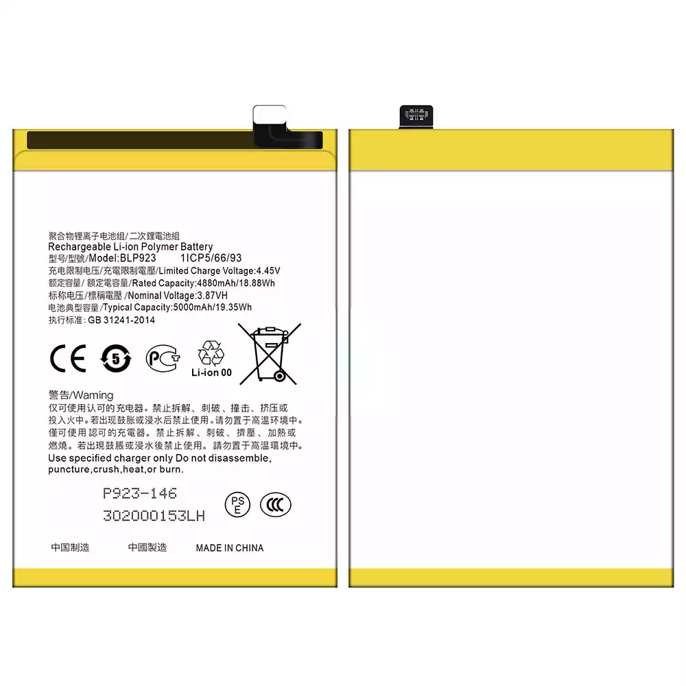 Bateria BLP923 para OPPO A57 2020 /A57 4G 2022 /A57 2022 /A77 4G /A77 5G /A77s /A78 5G /A97 5G / K10 5G / OnePlus Nord N20 SE /OnePlus Nord N300 5G /Realme C51
